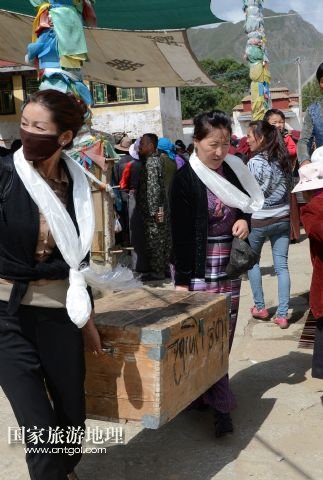 國家旅游地理 西藏拉薩8月9日訊 8月6日,在西藏堆龍德慶縣乃瓊鎮(zhèn)甲熱村,覺木隆藏戲團(tuán)團(tuán)長瓊達(dá)(前右)在演出后和團(tuán)員一起搬運(yùn)道具。藏戲是藏族人民喜聞樂見的藝術(shù)形式,而發(fā)源于甲熱村(舊稱覺木?。┑挠X木隆藏戲在藏戲各流派中流傳最廣。