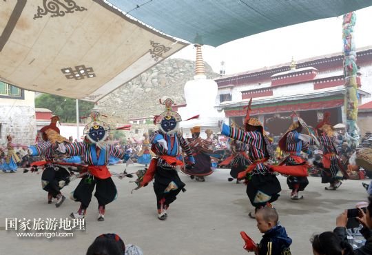 8月6日,在西藏堆龍德慶縣乃瓊鎮(zhèn)甲熱村,覺木隆藏戲團(tuán)的演員們?cè)诖謇锏难╊D節(jié)慶典上表演。