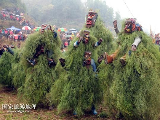 國家旅游地理 廣西柳州2月20日訊 2月16日,一名苗族青年戴著面具、披著芒草,扮成 “芒哥”跳舞。當日是農歷正月十七,地處深山的廣西柳州市融水苗族自治縣安陲鄉(xiāng)在江門苗寨舉行傳統(tǒng)的“芒哥節(jié)”。眾多苗族男性青少年戴著面具、披著芒草、扮成“芒哥”起舞,為人們驅邪避禍,送去新春的祝福。據(jù)介紹,演“芒哥”是當?shù)孛缂胰霜毦咛厣男麓簜鹘y(tǒng)活動之一。 /新華社發(fā)(龍濤 攝)