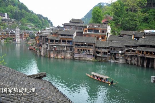 4月22日,游人在湖南湘西鳳凰古城核心景區(qū)乘船游覽沱江。