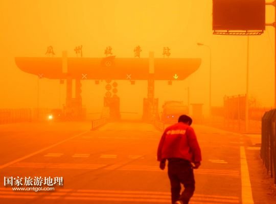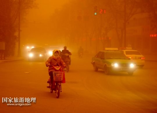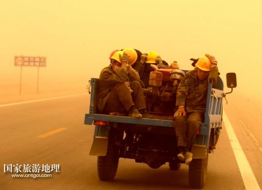 國家旅游地理 甘肅酒泉4月23日訊 4月23日,一輛拉載公路施工人員的三輪車在沙塵暴中行駛在酒泉市瓜州縣城郊的公路上。當(dāng)日,甘肅省酒泉市的敦煌市、瓜州縣等地遭受特強(qiáng)沙塵暴襲擊,最小能見度不足20米。當(dāng)日下午,酒泉市氣象臺(tái)發(fā)布沙塵暴紅色預(yù)警信號(hào)。 /新華社記者 聶建江 攝