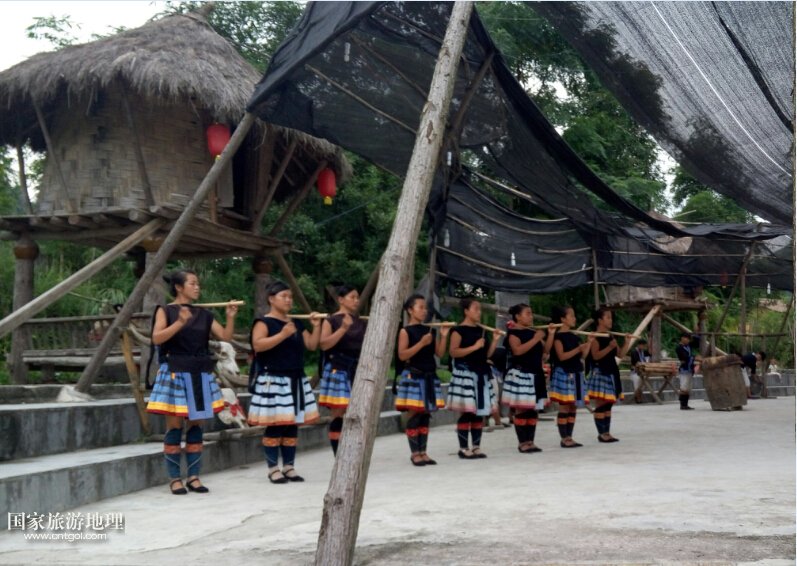 這是黔南荔波縣瑤寨姑娘在表演舞蹈。荔波瑤山白褲瑤是一個歷史悠久的古老民族,是一支長期深居高山密林,過著刀耕火種,自給自足的封閉式狩獵民族,至今仍保存著母系氏族社會向父系氏族社會過渡的遠古遺風,因其民族文化保存最完整而被聯(lián)合國科教文衛(wèi)組織賜予“人類文明的活化石”之稱。又因其崇拜太陽神,信奉百神靈,圖騰與遠在大洋彼岸的印第安人極為相似而被外界稱為“東方印第安人”。