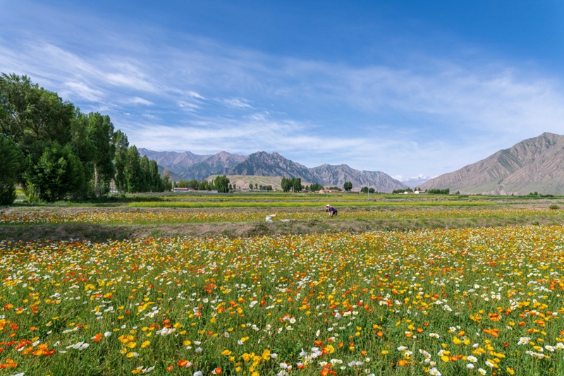 時(shí)值盛夏,地處祁連山北麓高海拔山區(qū)的甘肅省高臺(tái)縣新壩鎮(zhèn)紅沙河村種植的虞美人繽紛綻放,形成花海景觀。近年來(lái),高臺(tái)縣新壩鎮(zhèn)將花卉蔬菜制種作為特色產(chǎn)業(yè)來(lái)抓,積極引導(dǎo)農(nóng)戶規(guī)?;?、集中化種植,成為當(dāng)?shù)剞r(nóng)業(yè)增效、農(nóng)民增收的支柱產(chǎn)業(yè)之一。