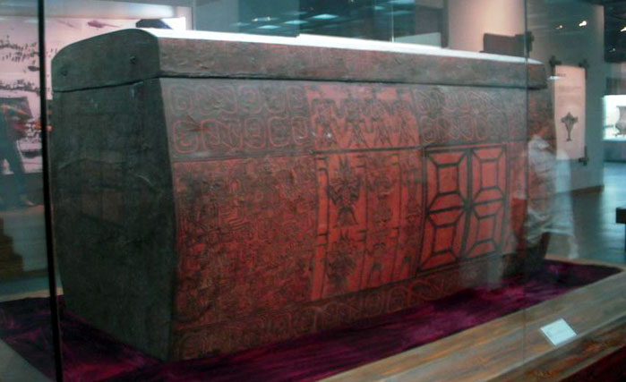 這些是曾侯乙墓內(nèi)的殉葬棺,棺木上都描繪有類似主棺的窗格,就是隨時準(zhǔn)備聽候召喚,以備出入的通道。人殉的陋習(xí)在中國很早就有了,并產(chǎn)生了相應(yīng)的制度,如“天子殺殉,眾則數(shù)百,寡則數(shù)十”。商代的人殉極其典型,到了戰(zhàn)國時期,由于認(rèn)識到勞動力對生產(chǎn)的總要性,以及在有限的層面認(rèn)識到人的尊嚴(yán),一些國家改用陶俑,陶馬來作為殉葬替代。曾侯乙墓的人殉較為特殊,殉葬者的骨骼齊全,不似奴隸社會殺殉的方法,可能是用“賜死”的方法迫令殉葬的。但無論如何,讓年輕的生者永遠(yuǎn)陪伴死者而進(jìn)入黑暗冰冷墓穴的全部過程,在當(dāng)時也是非常慘烈的。