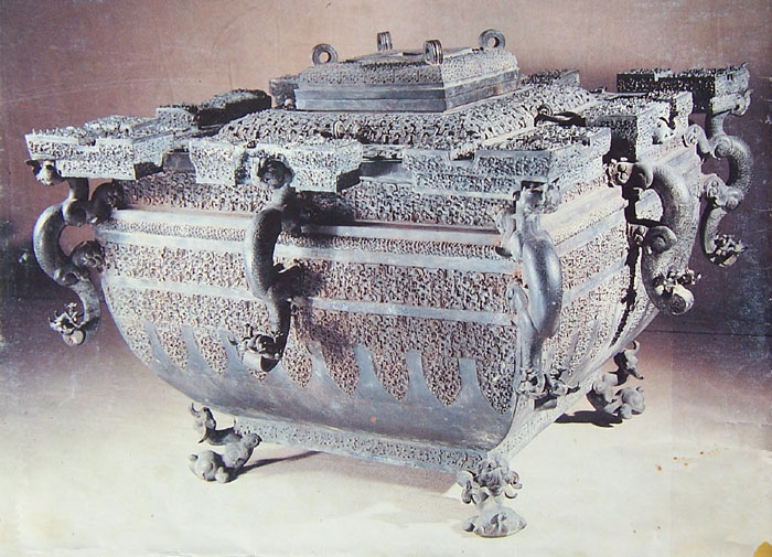 這一對青銅器叫做聯(lián)禁壺。壺是常見的酒器,禁是盛放酒器的幾案,很少見,迄今已知只有5件。幾案為什么叫禁?其實(shí)就是禁酒的意思。既用于飲酒,又提示戒酒,有些像現(xiàn)代紙煙盒上的廣告“吸煙有害健康”。在周代,周人對殷人嗜酒而失掉國家的惡劣習(xí)俗深惡痛絕,并擔(dān)心這一習(xí)俗死灰復(fù)燃,從而釀成新的社會的動亂,所以就常常以警示做出規(guī)定,銅禁的名稱就是這一政策的具體體現(xiàn)。